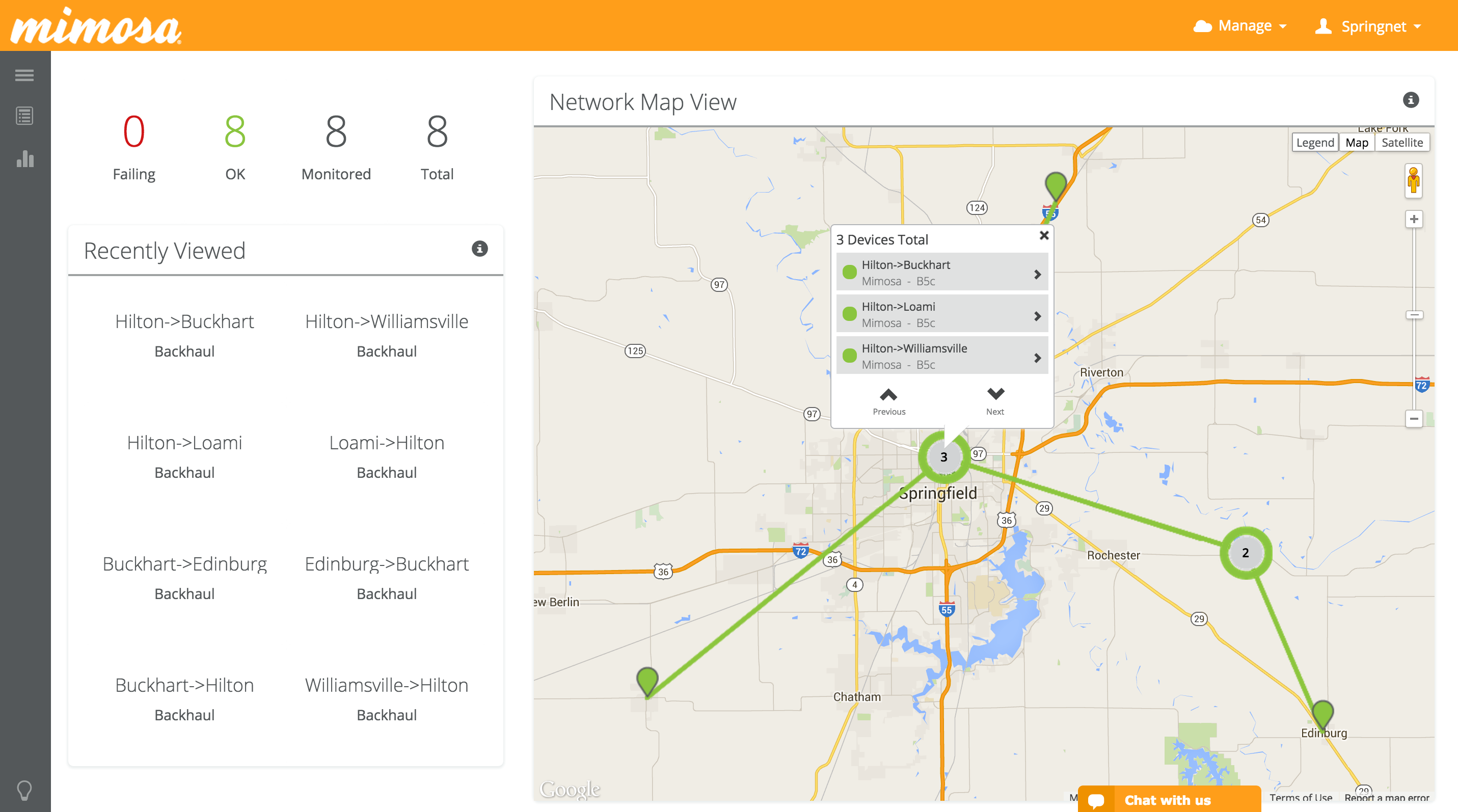 SpringNet1 leveraged the Mimosa B5c products to replace and collocate 4 links in their Springfield, IL service area all in the UNII-1 Band. Before replacement, the links were utilizing Ligowave and Alvarion hardware.